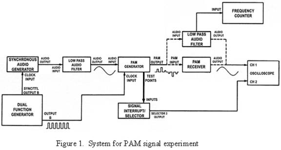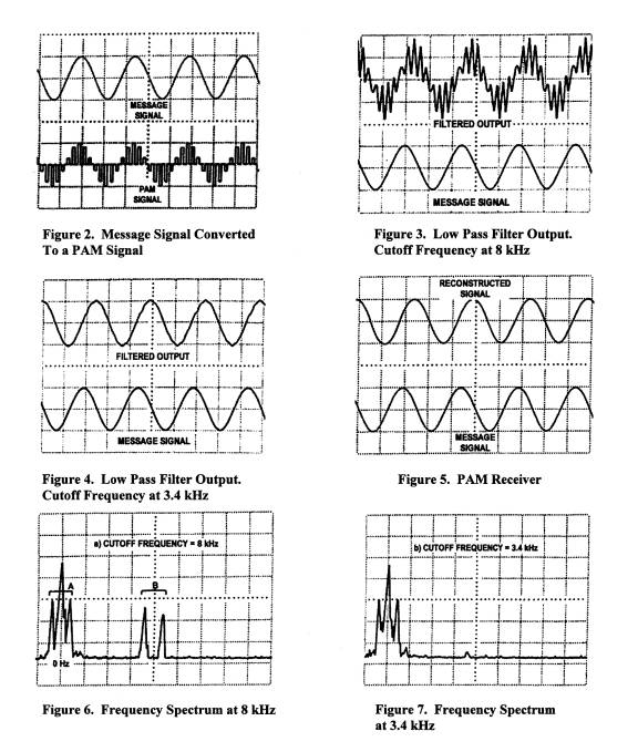 A PAM generator is used to construct a PAM signal form of a sine wave output from an audio generator. This is shown in Figure 2. The PAM signal is demodulated by two methods. One method uses a low pass audio filter, and the other method use a PAM receiver fixed at 3.4 kHz to allow good reception of the International Telecommunications Union (ITU) standard bandwidth signal. The PAM receiver has a high-order low pass filter incorporated. Measurements are taken at 8 kHz, and at 3.4 kHz in both time and frequency domains.