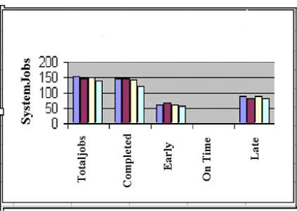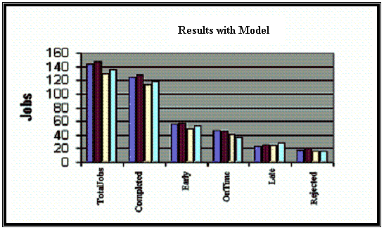 The system was tested under two different scenarios; first without implementing the model thus described and then with the model. In each case, the system started with four different jobs with each job having associated with it a size of 48, a due date, and process plan. After an initial feasible schedule of all these existing jobs, the simulation was enacted with jobs coming in at an exponential rate. During each run, three machine failures were introduced. The result is shown in the bar graph Figures 5a and b, the system with the model shows an overall improvement of 29%