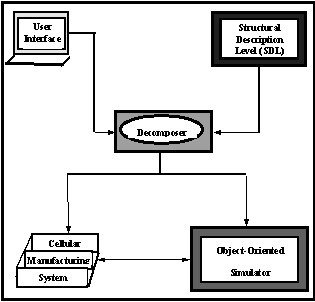 The object-oriented methodology used was structured analysis, which is a top-down procedure using a hierarchical data flow process to describe and analyze each lower level process. For the simulation system, the initial steps involve the description of the manufacturing system in terms of objects and the definition of appropriate tools for models and their simulation. The following description of the modules should be read in conjunction with Figure 1: