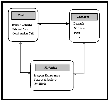 Static elements are those which, despite the random effect of the system environment, remain invariant during the entire execution phase. This group includes the initial process plan which remains constant during the process. Also included are the cells selected for a part, according to the process plan or alternate process plan (APP). If the cell selection arriving from the basic process plan is no longer valid (because of e.g. machine breakdown), the alternate process plan (APP) can be used to select a substitute cell for a part operation.