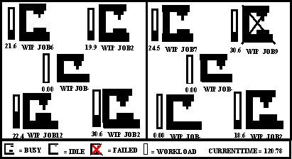 1. The first of the two classes is the Graphic User Interface (GUI). When the user selects an option from the menu item that allows the running of the system with animation, the GUI is automatically displayed so the user can view concurrently the action of the system as it runs. In this class, different manufacturing objects are represented by symbols of different shapes, and each object type is distinguished by color. For example, when a machine breaks down, the system is designed to ring a bell alerting the user to the situation and to also flash in red the symbol representing the machine object that has broken down. An overloaded (bottleneck) machine is indicated by a complete 'blacking out' of the symbol that represents the workload. Figure 4 is an illustration of the state of the workcell objects during execution. The workcell state shown involves the display of three different symbols for each workstation. The first represents the machine, the second is the part on which the machine is currently performing an operation, and the third is the percentage of workload on the machine at any given time. These symbols are displayed simultaneously throughout the execution. Each cell, rather than having a work-in-process (WIP) buffer between machines, is equipped with large central buffers.