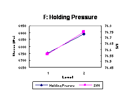 Control factors such as holding pressure and melt temperature are the most significant factors affecting tensile strength. Other control factors had varying effects on the stress, but none of them was significant. The noise-factor, room temperature, was also found to have no significant effect.